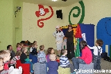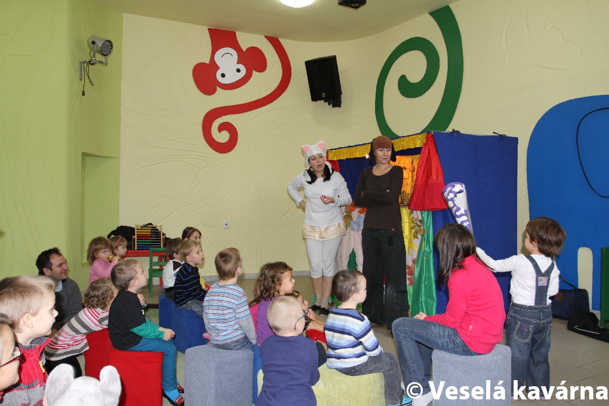 Fotografie z dětského divadla ve Veselé kavárně. Představení pro děti Jak Pejsek a Kočička pouštěli draka. Podzimní pohádku provází Pejsek s Kočičkou, vyrobí společně s dětmi papírového draka, však proradná Vrána jim to chce pokazit …
