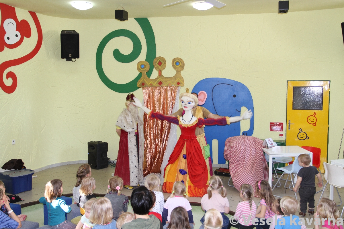 Fotografie z představení pro děti Princezna s dlouhým nosem. Pohádka o tom, jak zlobivou princeznu postihla nejedna pohroma - narostly jí uši jako lopušáky, jelení parohy a dlouhý nos. Pohádku hrají dva herci, loutka veverky v nadživotní velikosti a loutka princezny v životní velikosti, která ze sebe vysouká nos 40m dlouhý. S takovým nosem se užije plno legrace po celé Veselé kavárně i venku.